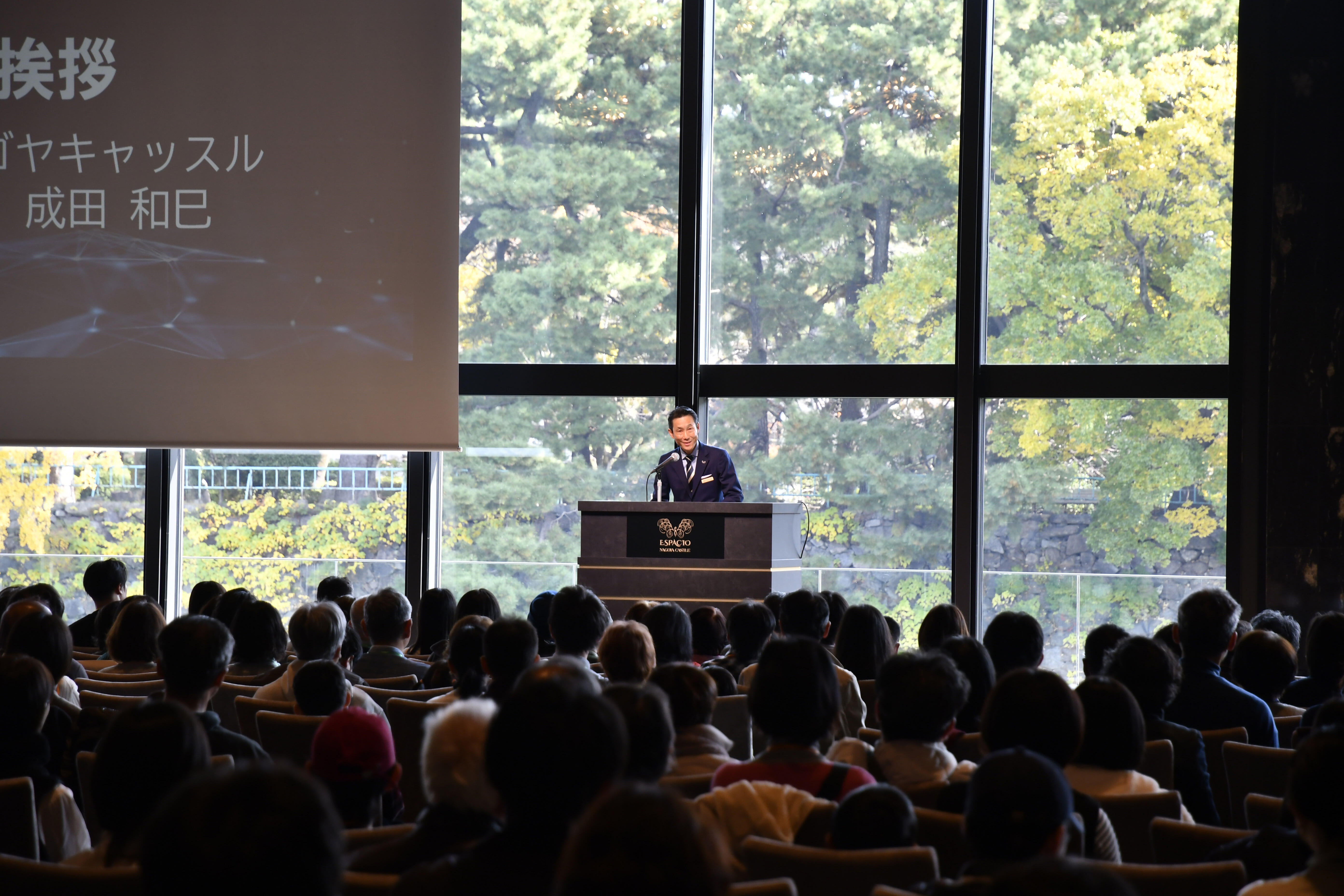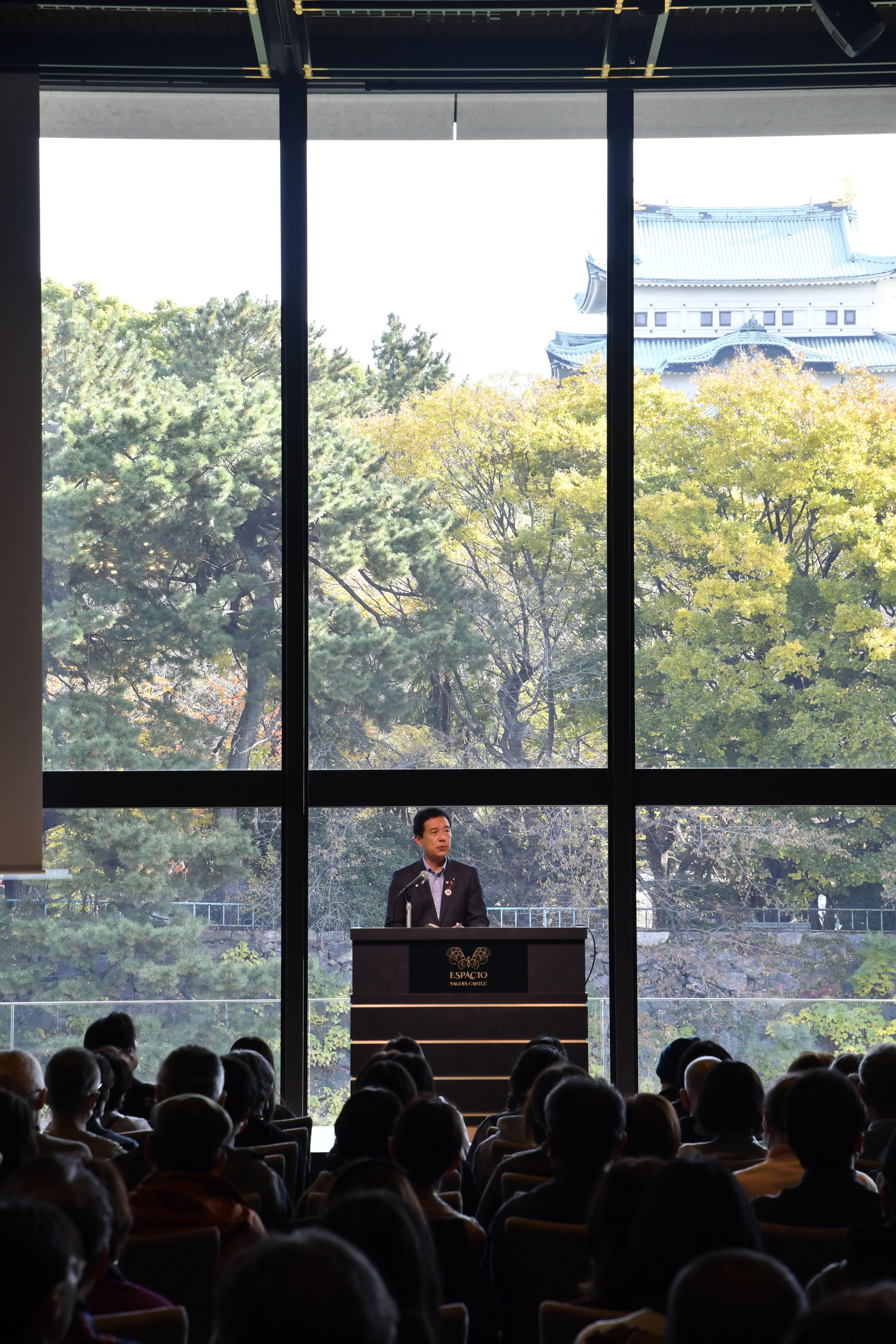 イベントは10時に開始し、まずは開会挨拶として、名古屋市長の広沢一郎、エスパシオ ナゴヤキャッスル副総支配人の成田和巳様にご登壇いただきました。広沢市長からはイベント関係者への感謝と名古屋城という貴重な歴史資源を活用した魅力づくりに繋がる本イベントの意義などをお話ししました。また、イベントに際し、名古屋城総合事務所とエスパシオ ナゴヤキャッスルが協力して作成した動画を放映し、成田副総支配人からは10月に新たにオープンしたエスパシオ ナゴヤキャッスルの魅力などをお話しいただきました。
