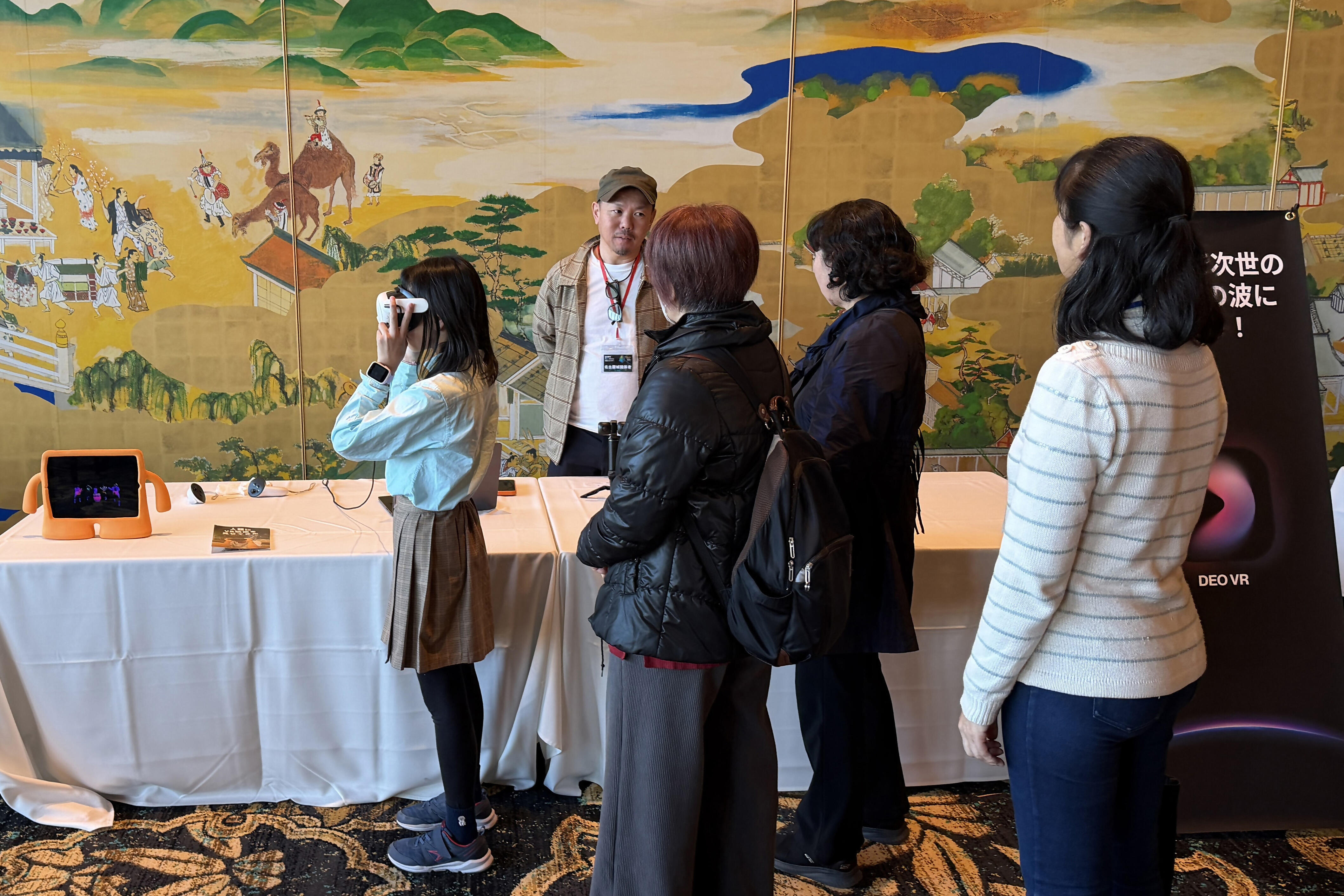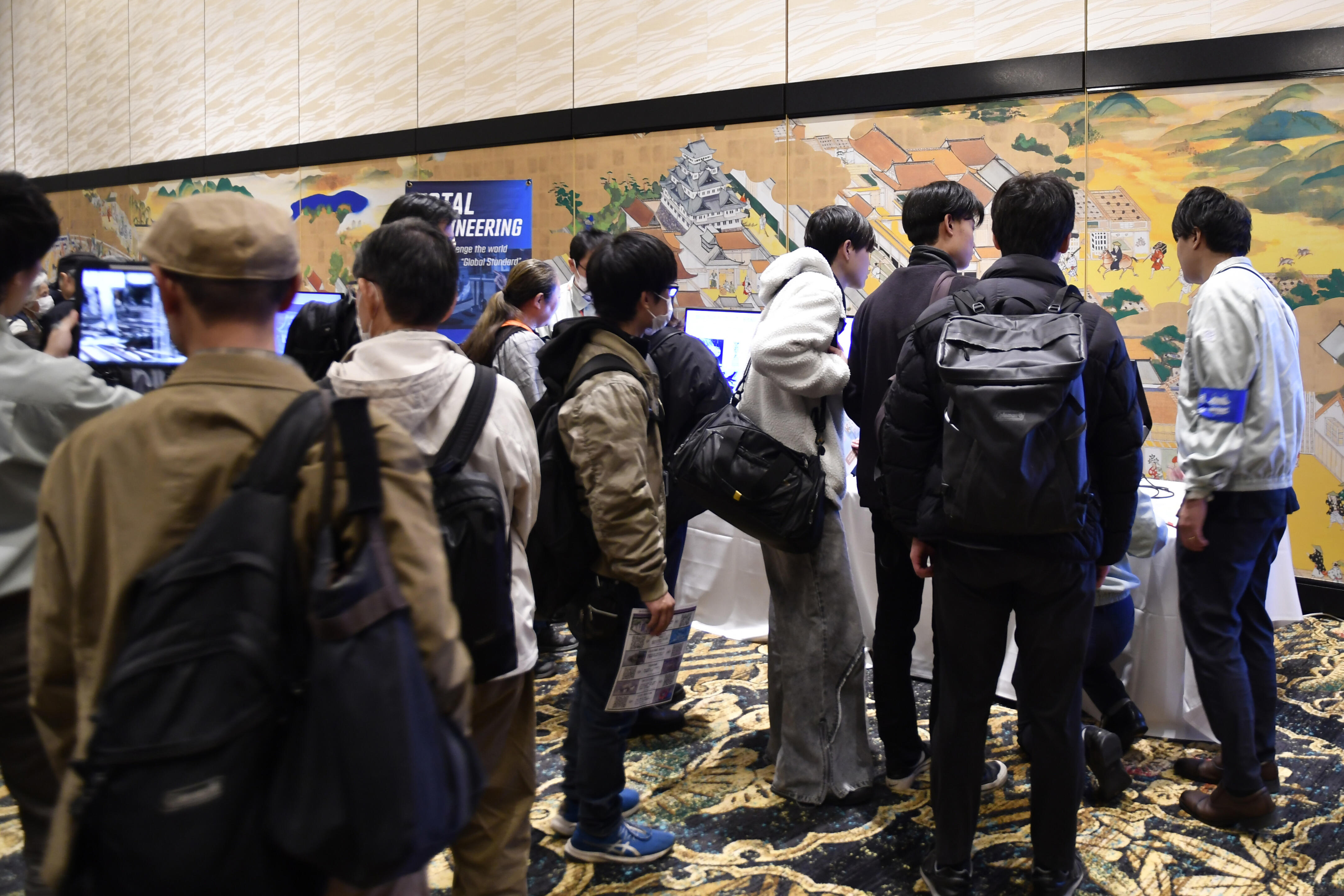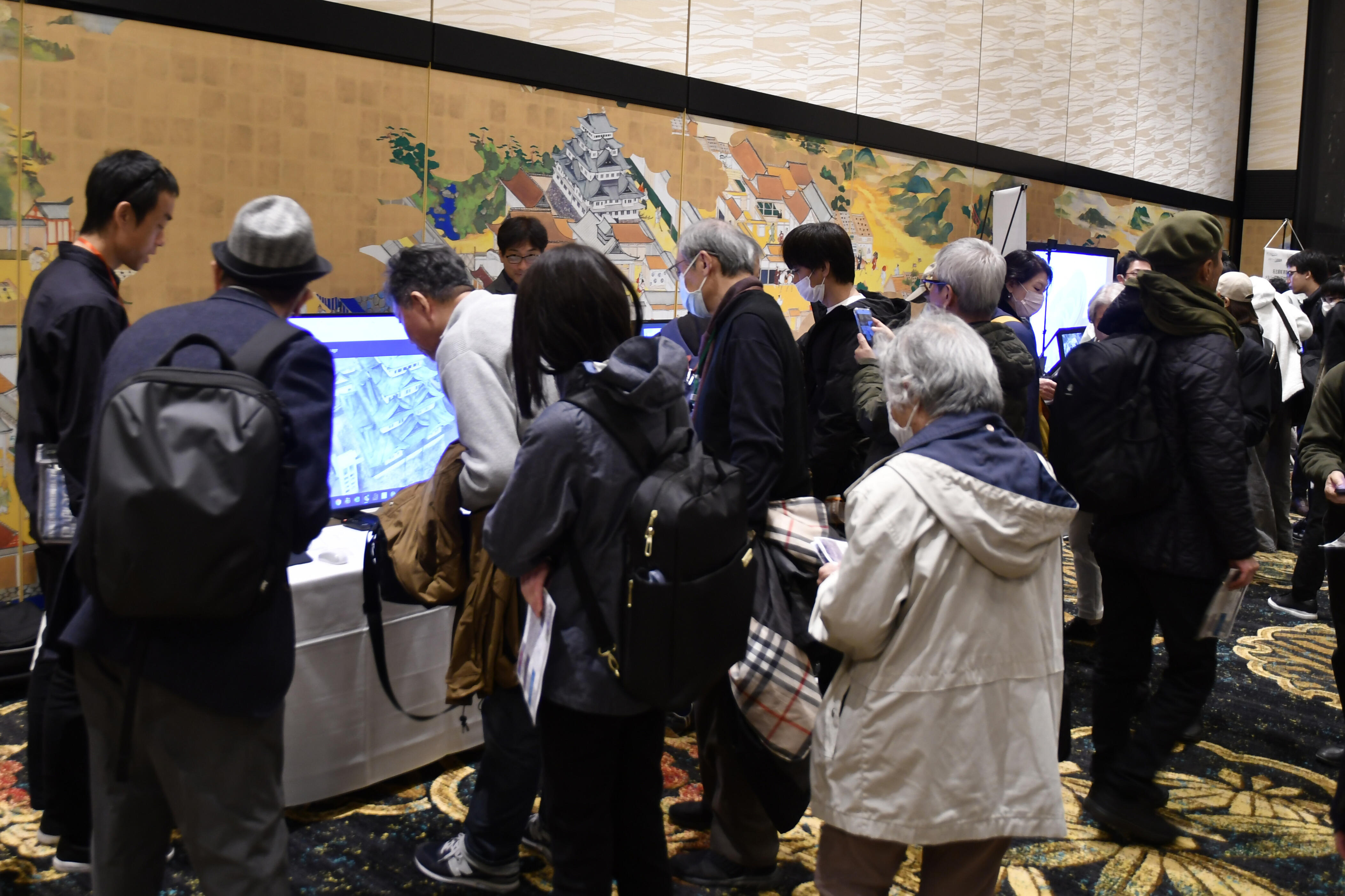 発表後、司会より午後のプログラムの注意事項を説明し、お昼休憩となりました。会場では協力会社による体験展示を5ブース出展していただき、多くの参加者の皆様に名古屋城に関連する3D・XRコンテンツを実際に体験していただきました。