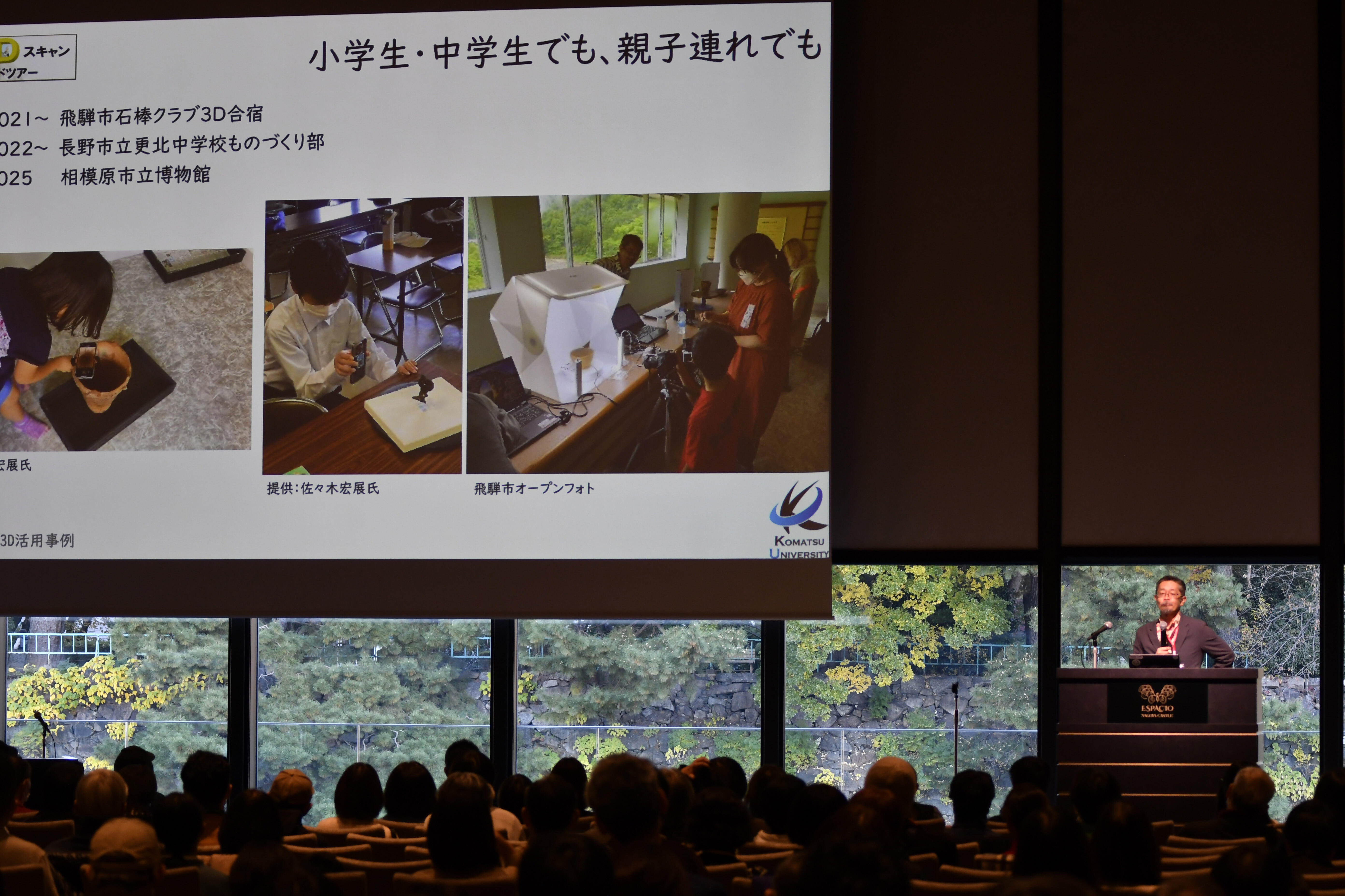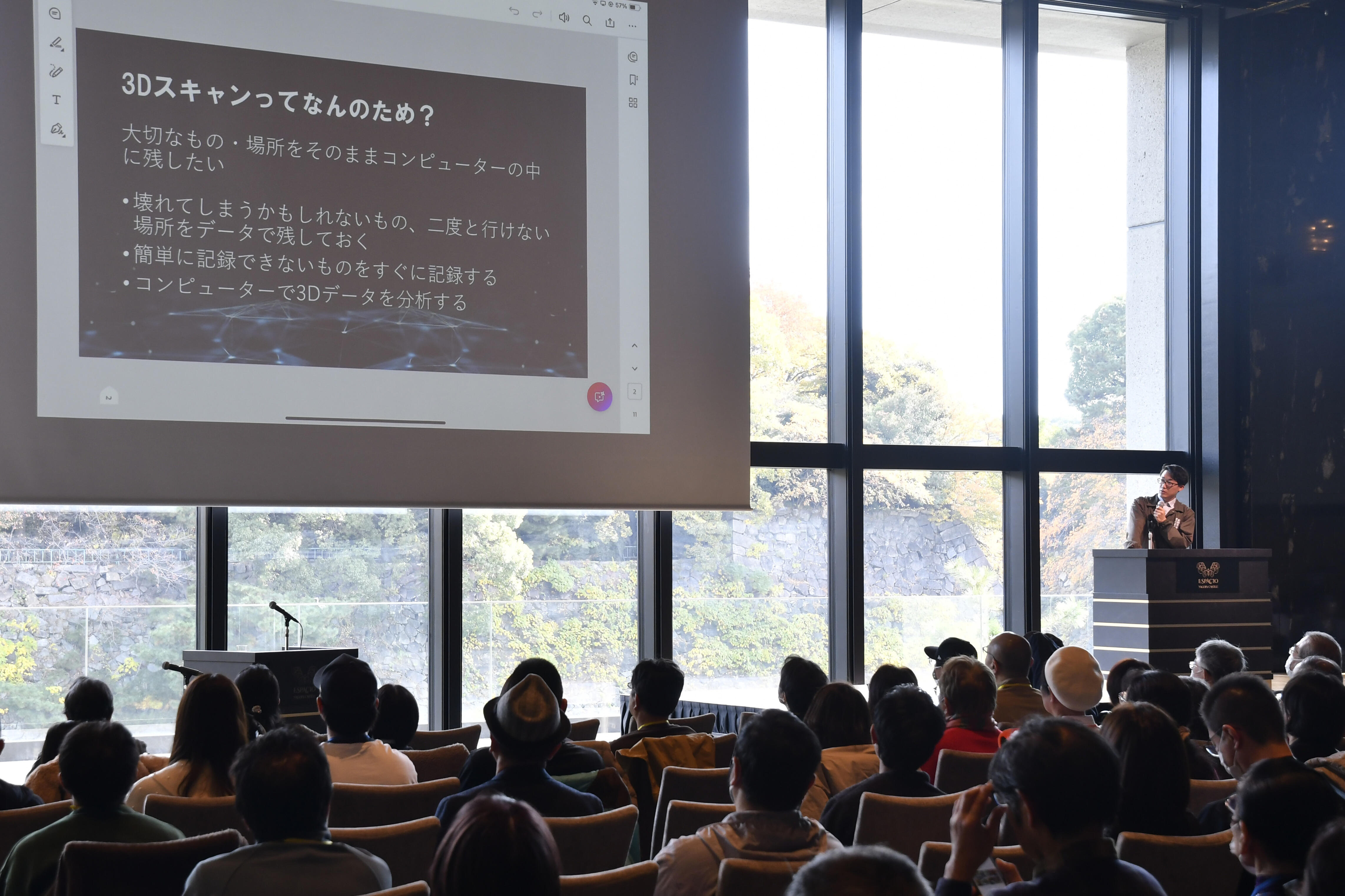 続いて、公立小松大学次世代考古学研究センターの野口淳様より、「文化財でのスキャン活用事例」をご発表いただきました。野口様は、文化財の3D化と計測機器・技術の変遷をたどり、今では誰もが文化財を気軽に3Dスキャンできる時代になったと語ります。そこから子ども向けのワークショップを進め、参加体験によって学びが変わった事例などをご紹介いただきました。こうした動きは海外にも広がっており、「3Dは言葉を超える」と締めくくられました。