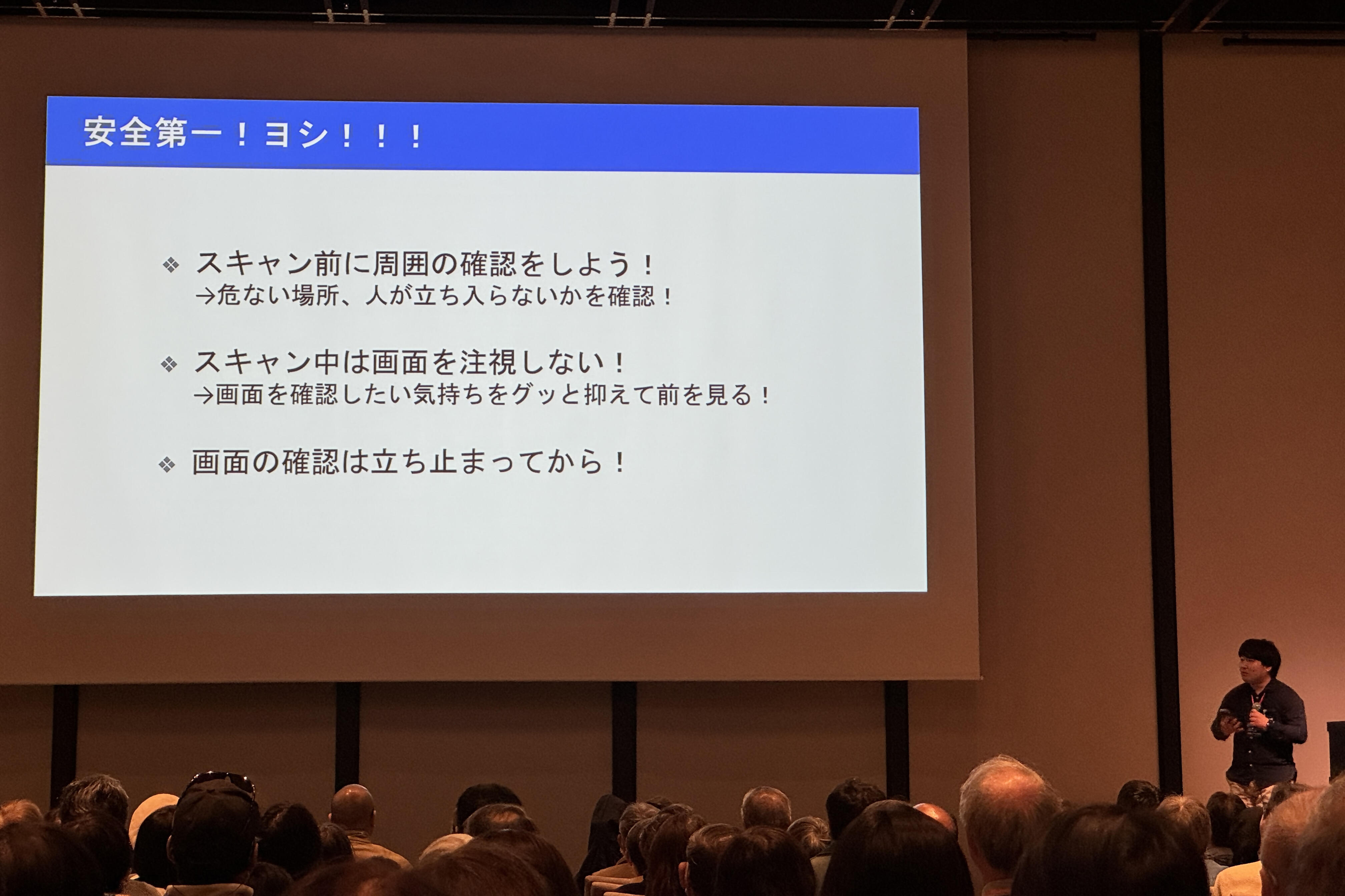 続いて、ナイアンティックスペーシャル株式会社の白石淳二様、モバイルスキャン協会の岩間輝様による、「スマホで3D!Scaniverseを使ってみよう&体験してみよう」の発表がありました。白石様は、本イベントで使用するスマートフォンアプリの「Scaniverse」を紹介し、思い出・もの・場所を記録するのに優れており、様々な機能で多様な業種・場面で活用されていると語りました。岩間様からは、3Dスキャンは安全第一で行うことなど注意すべき点をお話しいただき、3Dスキャンを実演しながらどのようにスキャンを行うと良いかの解説があり、3Dスキャンの手順・コツを学びました。