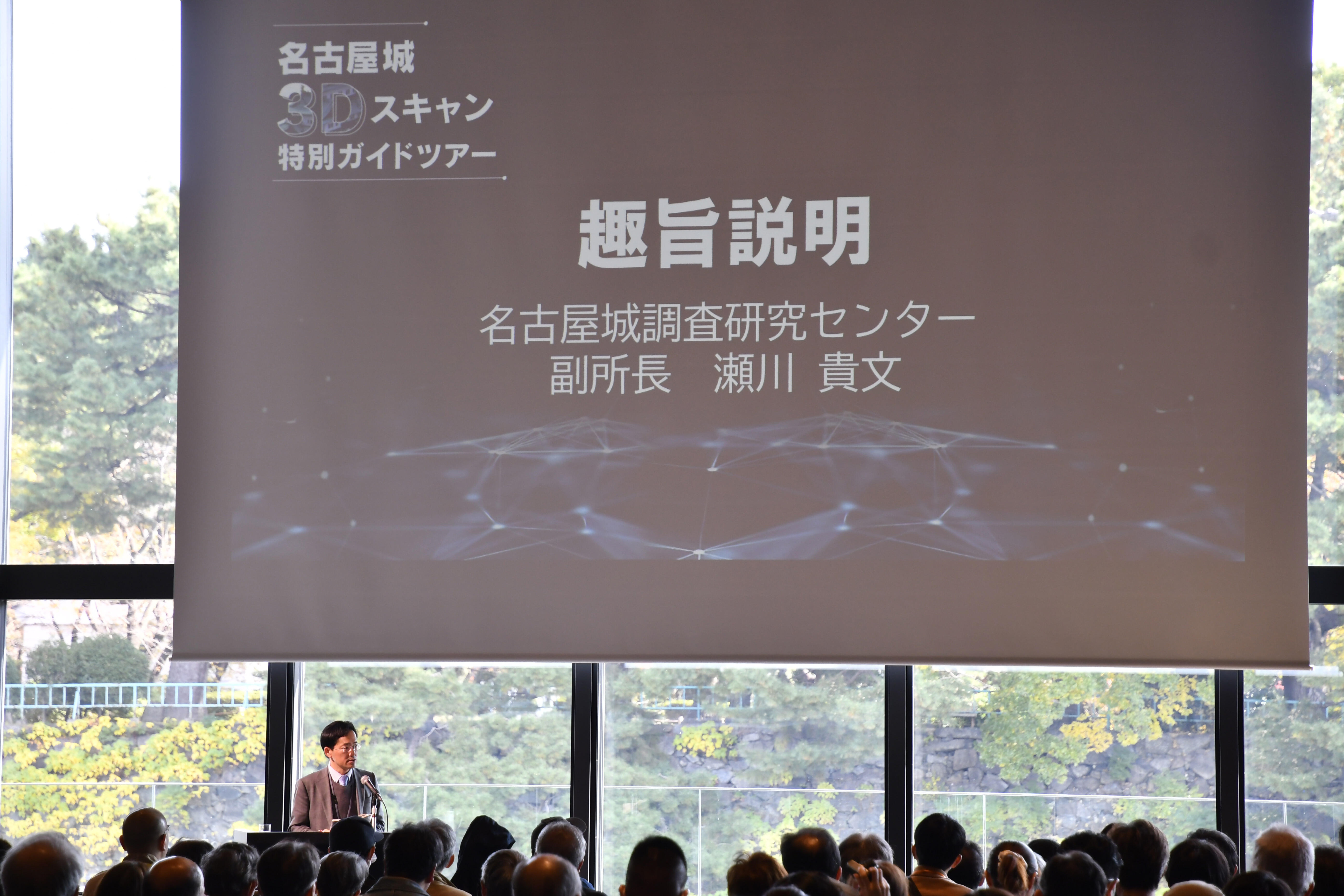 次に、司会を務める名古屋城調査研究センター副所長の瀬川貴文より趣旨説明を行いました。本イベントには多くの応募があったこと、名古屋城調査研究センターでは考古学や文化財の分野で従来の研究手法に加えて3D技術を活用していることなどをお話ししました。