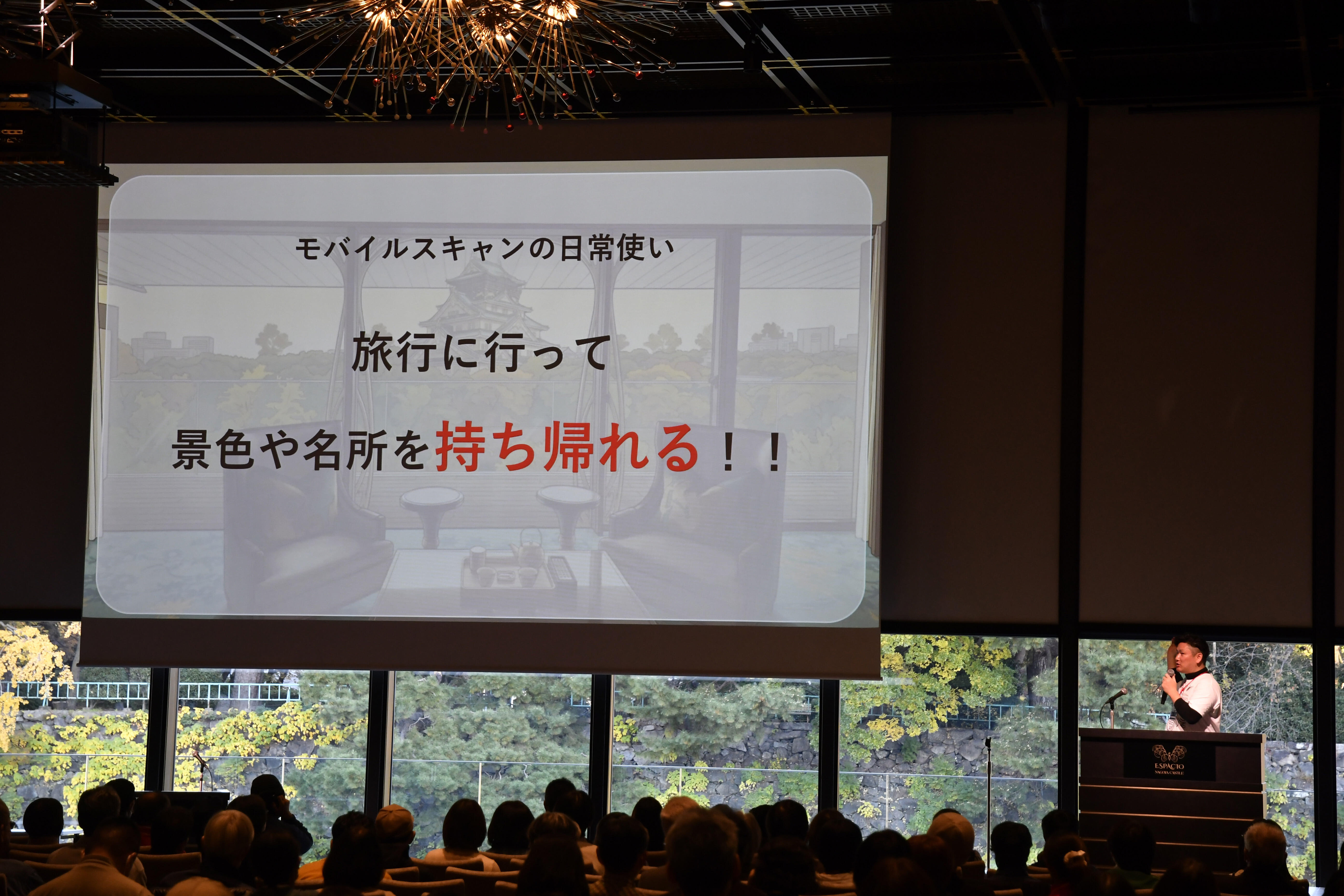 振り返りの後は、株式会社桑山瓦の桑山優樹様から「普段使いのモバイルスキャン」をご発表いただきました。桑山様からは、日常生活での3Dスキャン活用方法の解説などがありました。3Dスキャンした自宅をスマホで持ち歩くと、家具を選ぶときに参考になったり、寸法を測れたりして役に立つと、実演も行いながらで分かりやすく教えていただきました。