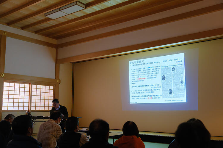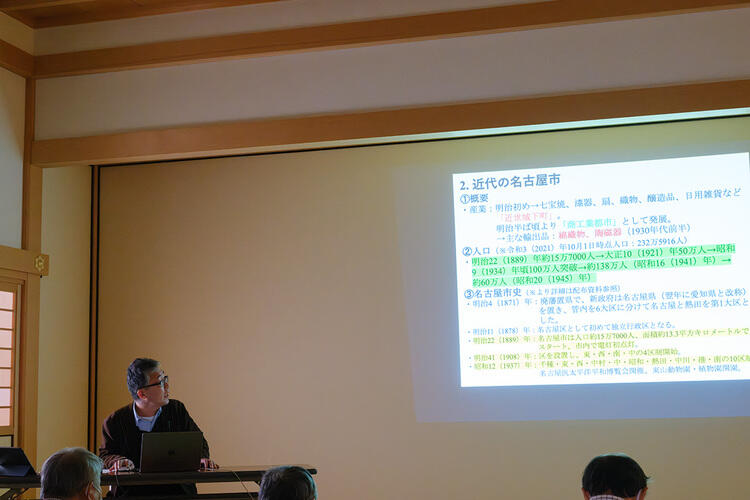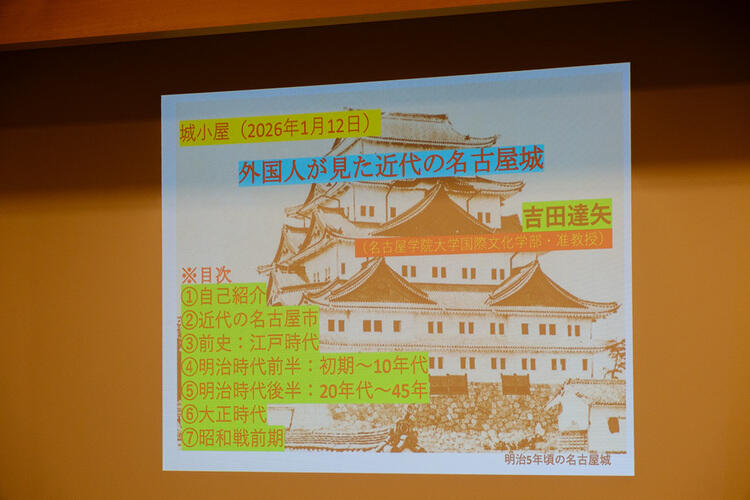 2026年1月12日、名古屋学院大学国際文化学部准教授の吉田達矢さんを先生にお招きし、名古屋城本丸御殿孔雀之間で「外国人が見た近代の名古屋城」を開催しました。